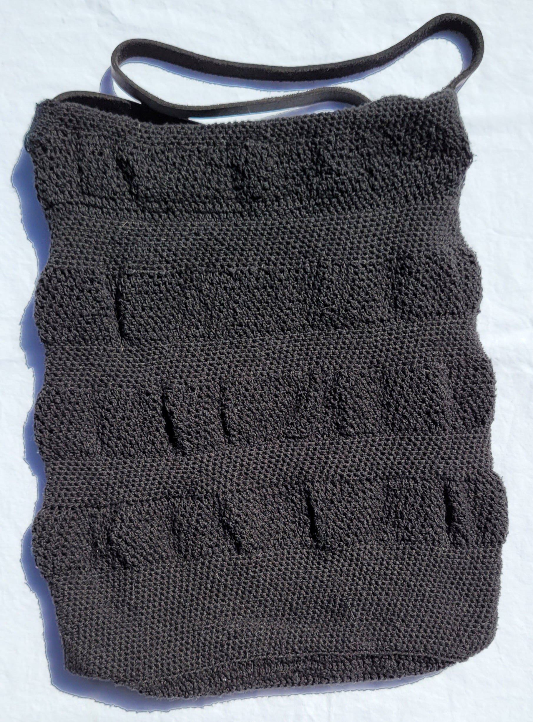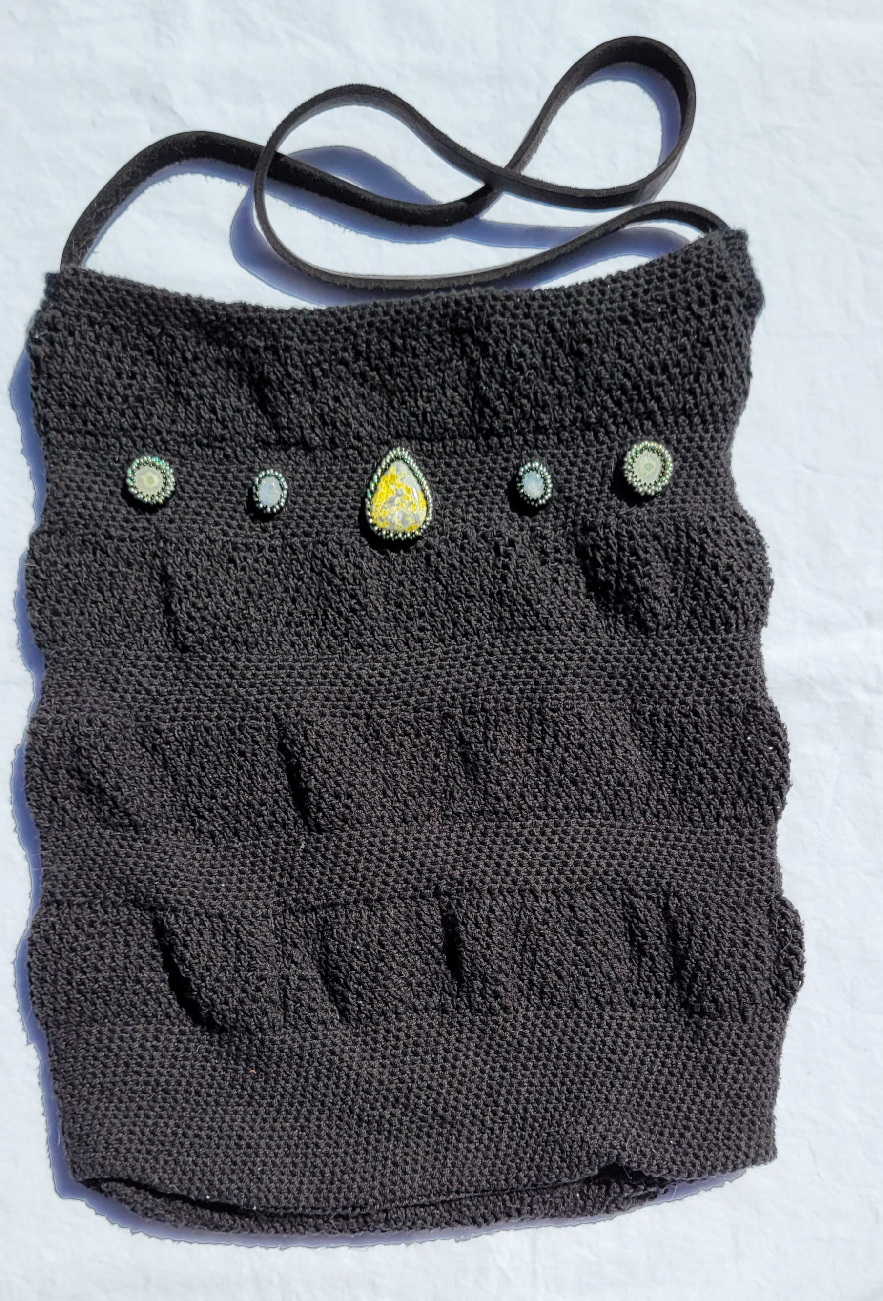This 5 Stones handbag made up of 2 solar quartz stones, 2 moonstones, and 1 green jasper stone. Stones are set in by seed beads stitched in to the black yarn crochet. The bag has a leather strap with a hand sewn in lining.
