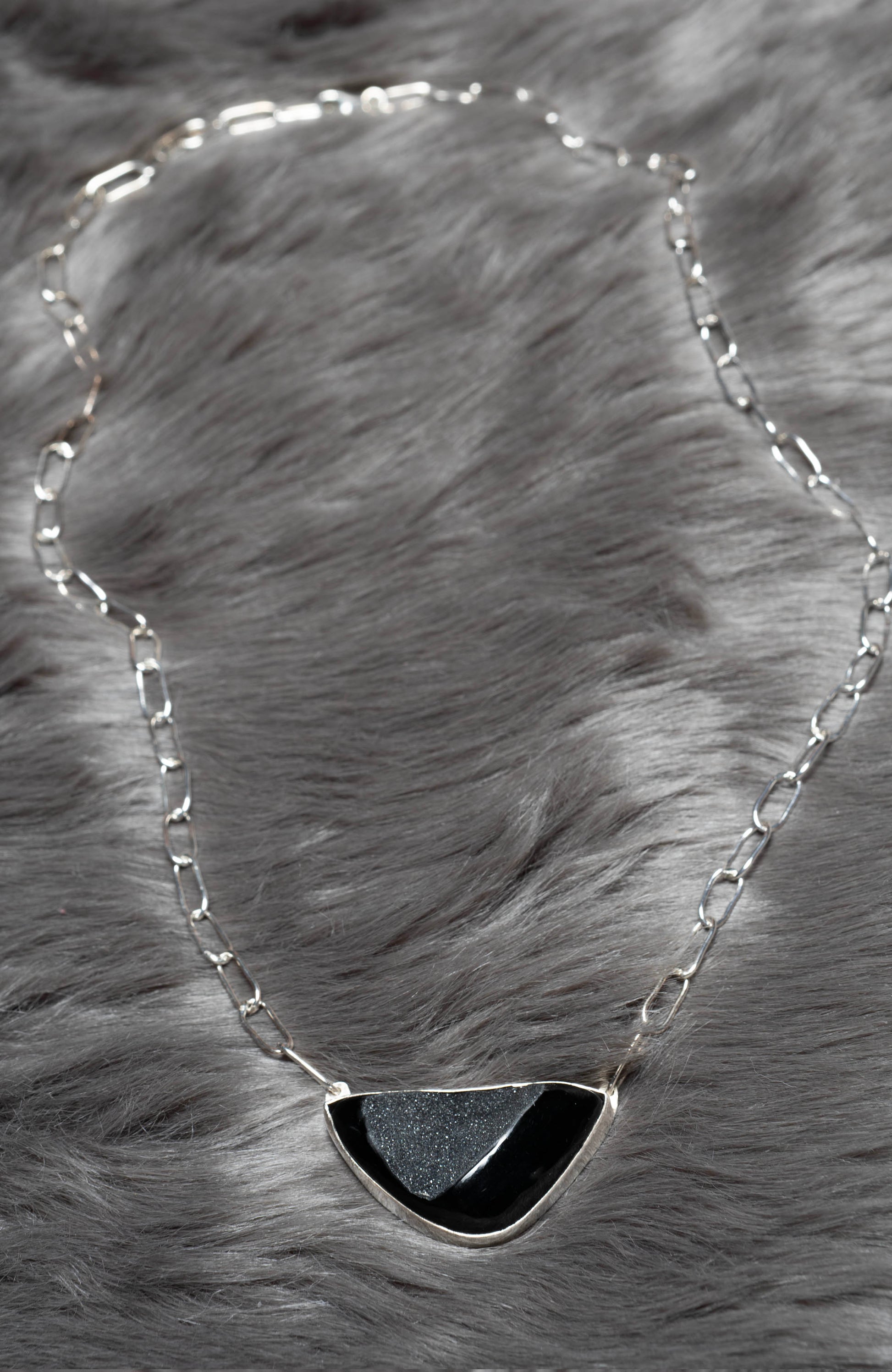 Black Onyx stone set in fine and sterling silver. Set on a 20in handmade paper clip sterling silver chain.