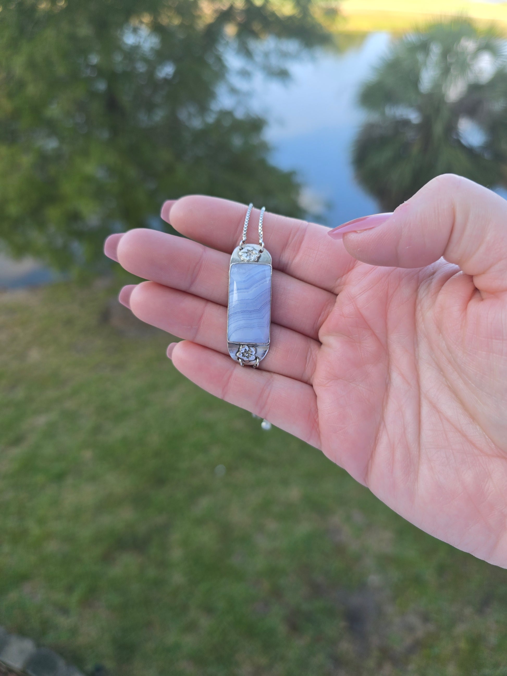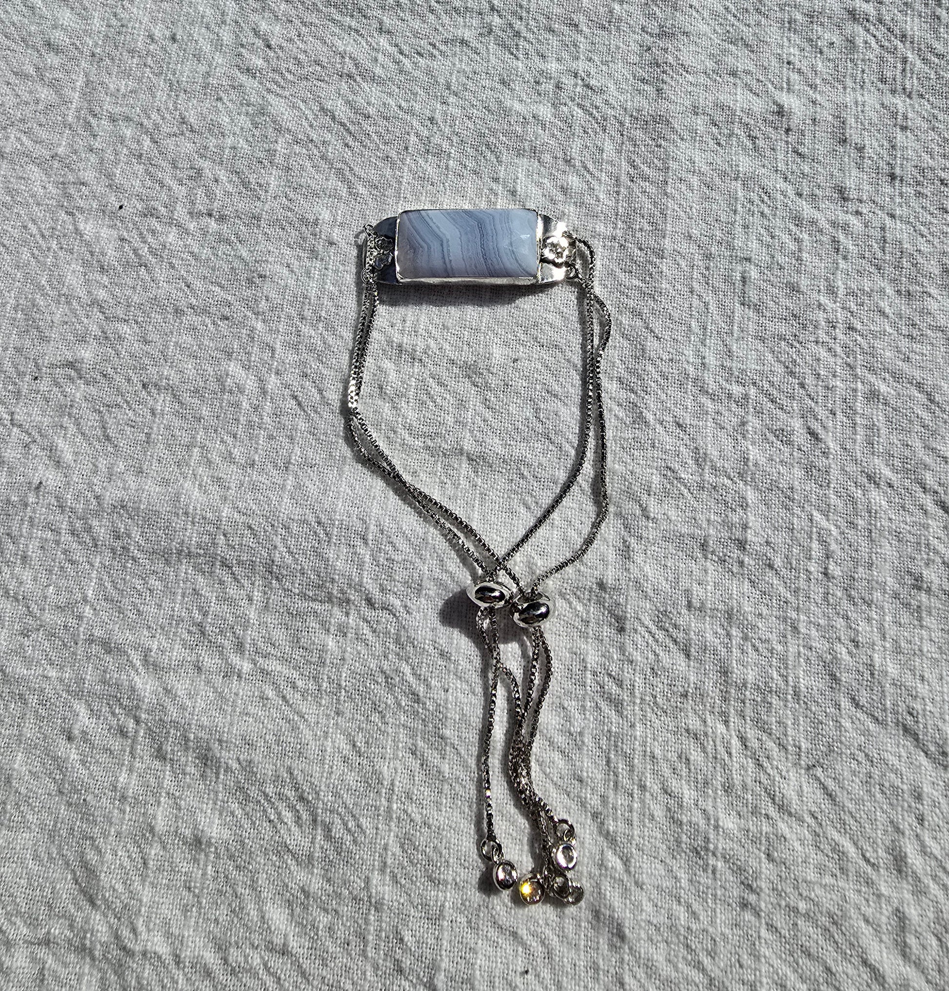 I created this bracelet around a gorgeous piece of Blue Crazy Lace Agate—one of my favorite stones for its flowing bands of soft blues, creams, and stormy greys. The stone looks like a tiny ocean current captured in time, and setting it in sterling silver gives it a cool, clean frame that highlights every swirl and ribbon of color. To keep the design comfortable and easy to wear, I finished it with a lightweight double-chain pull closure, so you can adjust the fit perfectly.