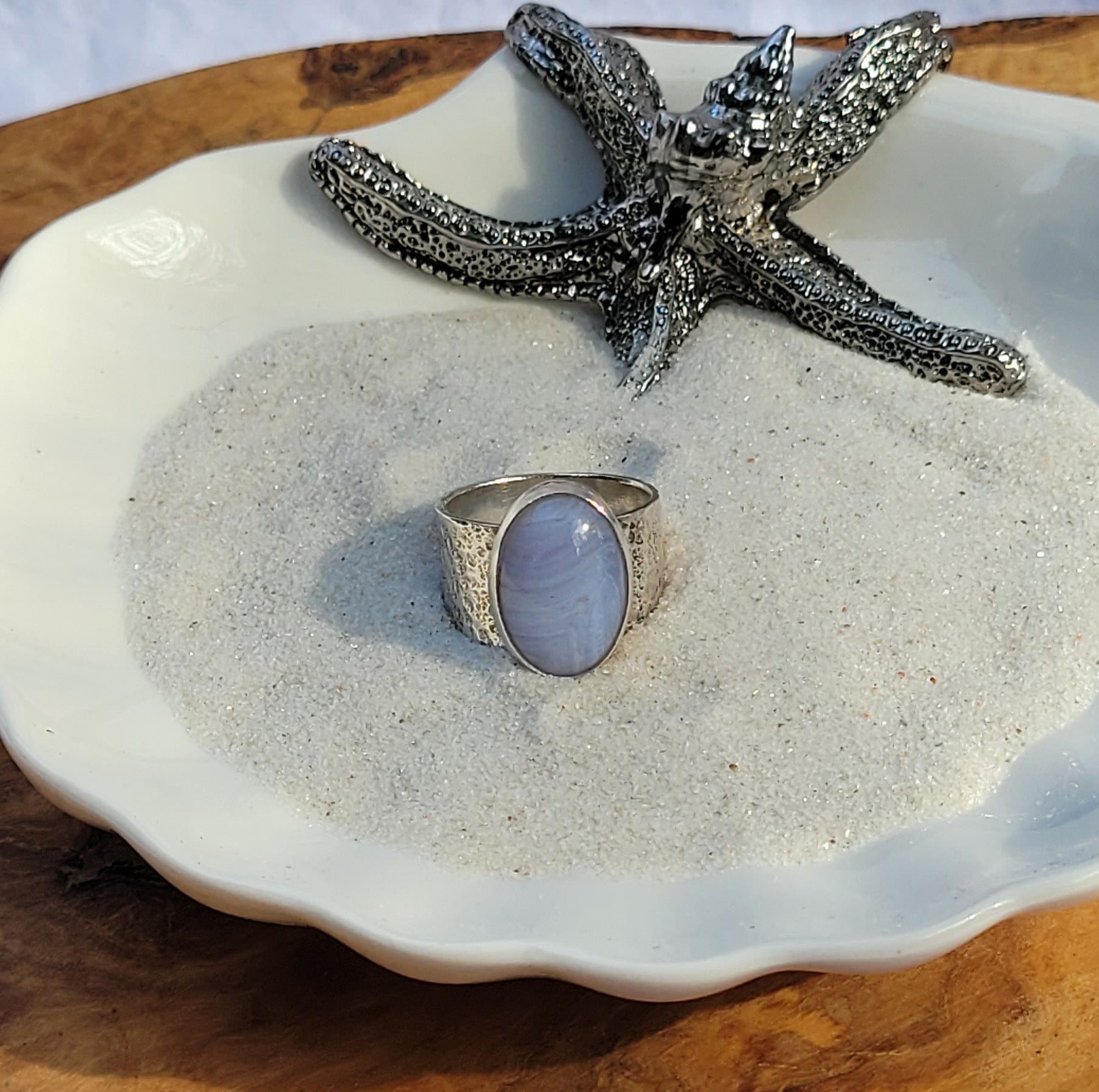 The ring was crafted using a blue lace agate stone, fine silver and sterling silver.