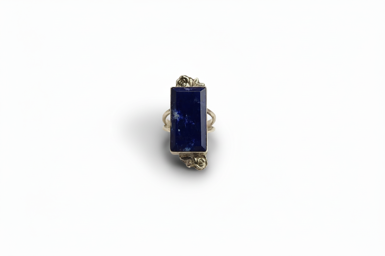I handcrafted this size 7.50 ring using a square faceted Lapis Lazuli stone, its deep blue color highlighted by tiny specks of white matrix that give it a striking, celestial depth. To complement the stone, I added handmade sterling-silver rose accents—each one shaped with soft, organic details that bring a romantic touch to the design. The stone is set in fine and sterling silver, and the double band adds both strength and a comfort. Lapis Lazuli is often associated with wisdom, clarity, and inner truth. Its energy is believed to support intuition, communication, and emotional confidence.