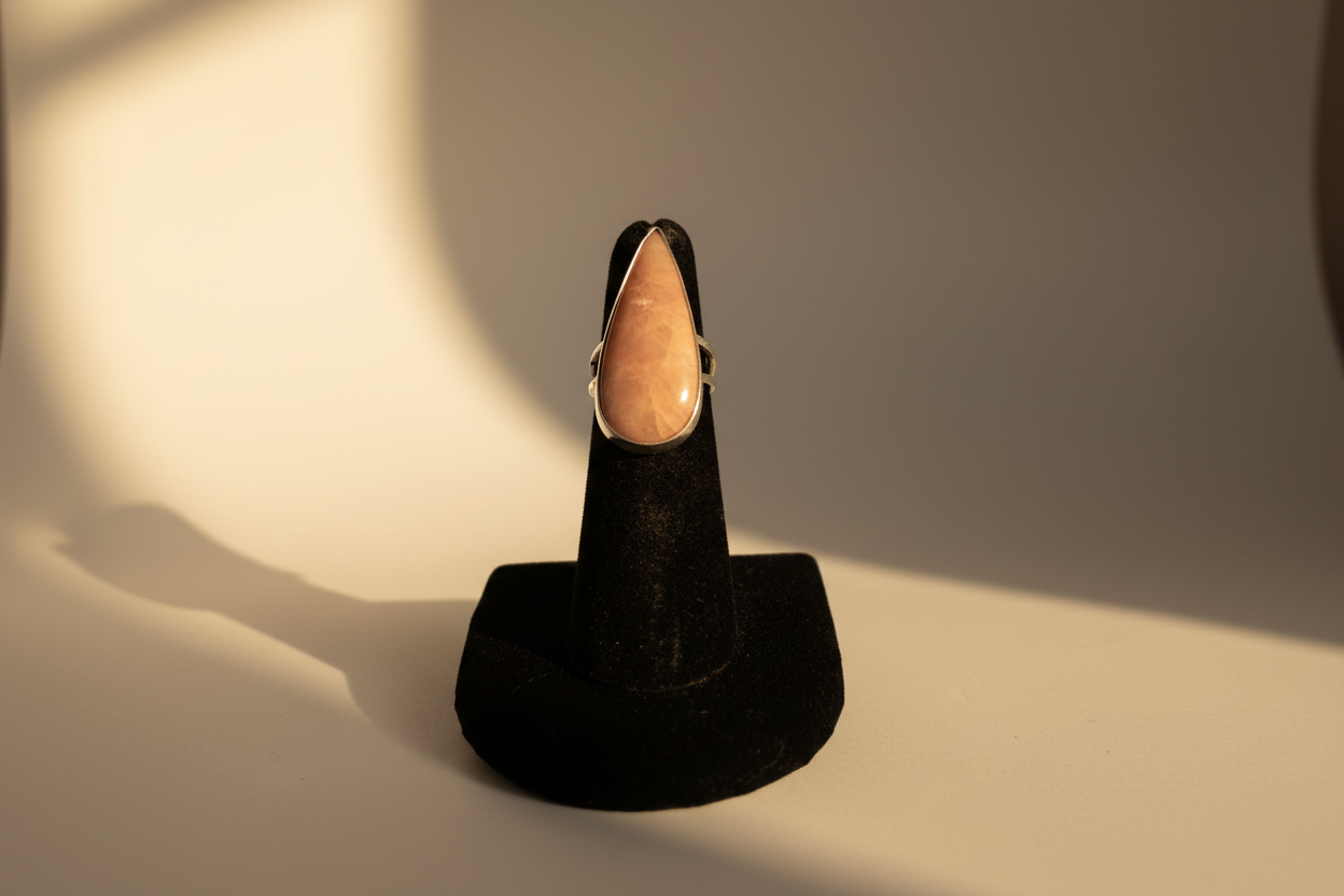 Stone set in sterling silver with a double band. The size of the ring is 5.