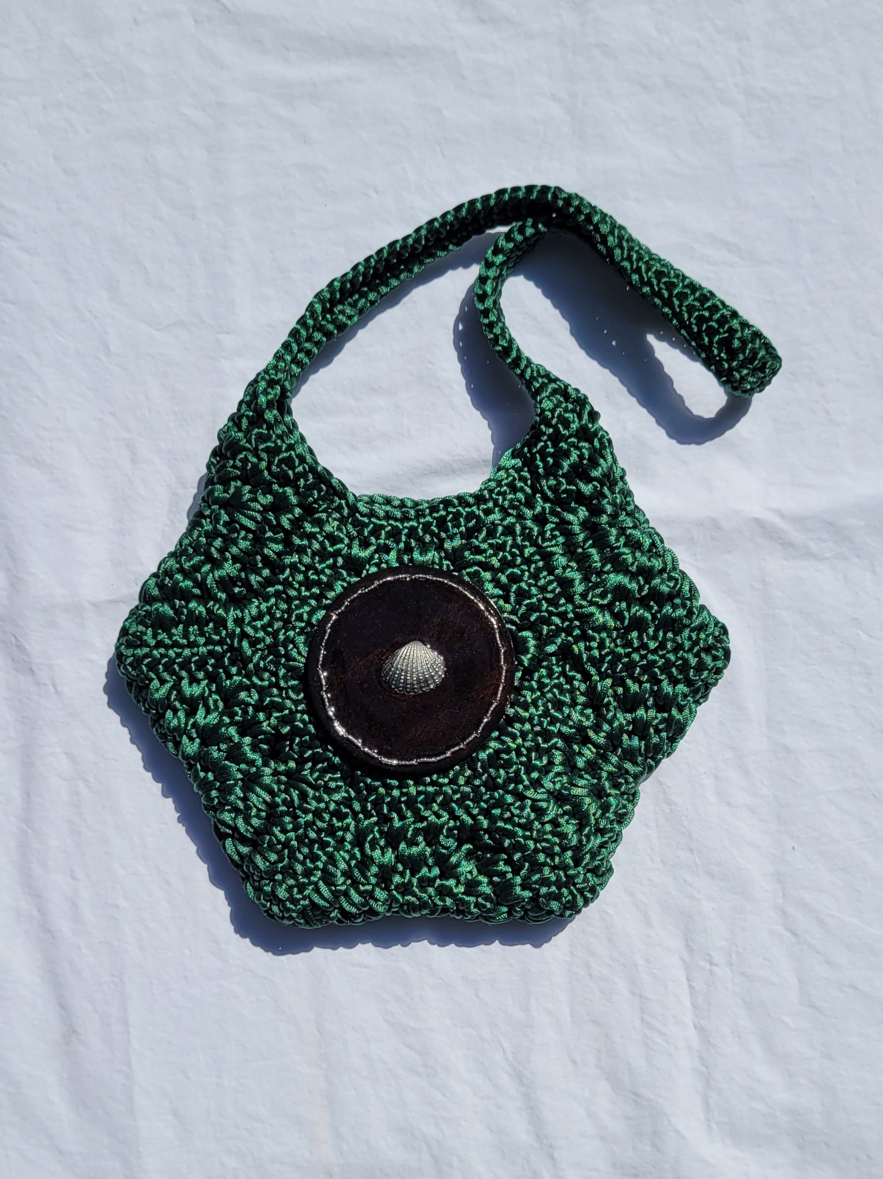 This is a small and is hand crocheted by me. I have used silk cord to crochet the bag with a round accent wooden medallion designed with beading and a seashell. As well as a hand stitched in fabric lining. The silk cord used gives a rich color and quality feel to the handbag itself.