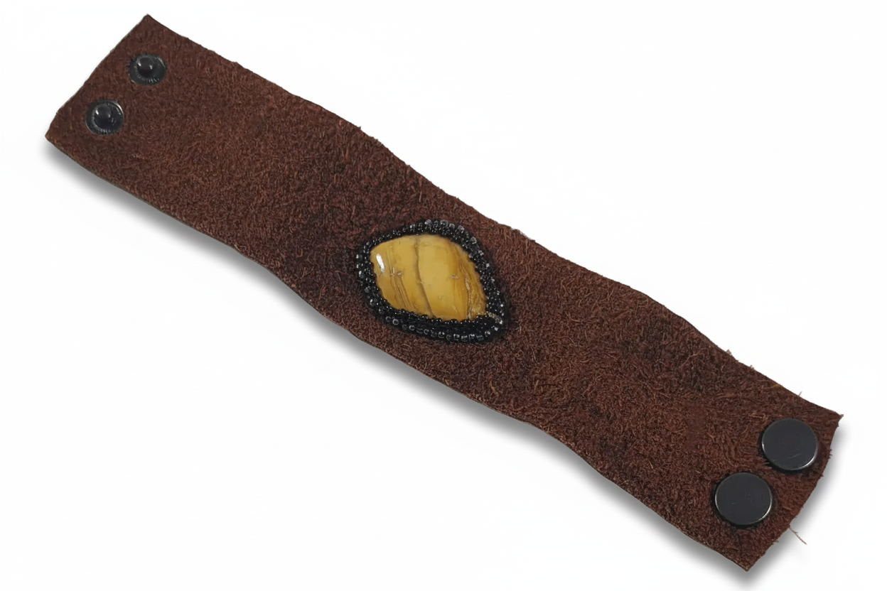 Cuff is made with a Yellow jasper stone stitched into leather with seed beads wrapped around stone.